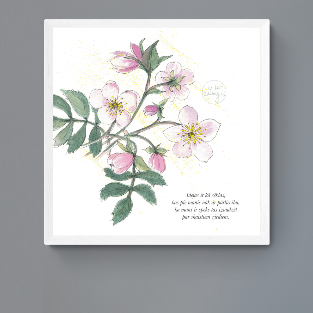 Aigas Kalniņas ilustrācijas reprodukcija ar afirmāciju no "Iedvesmas kalandārs 2025" baltā koka rāmī.